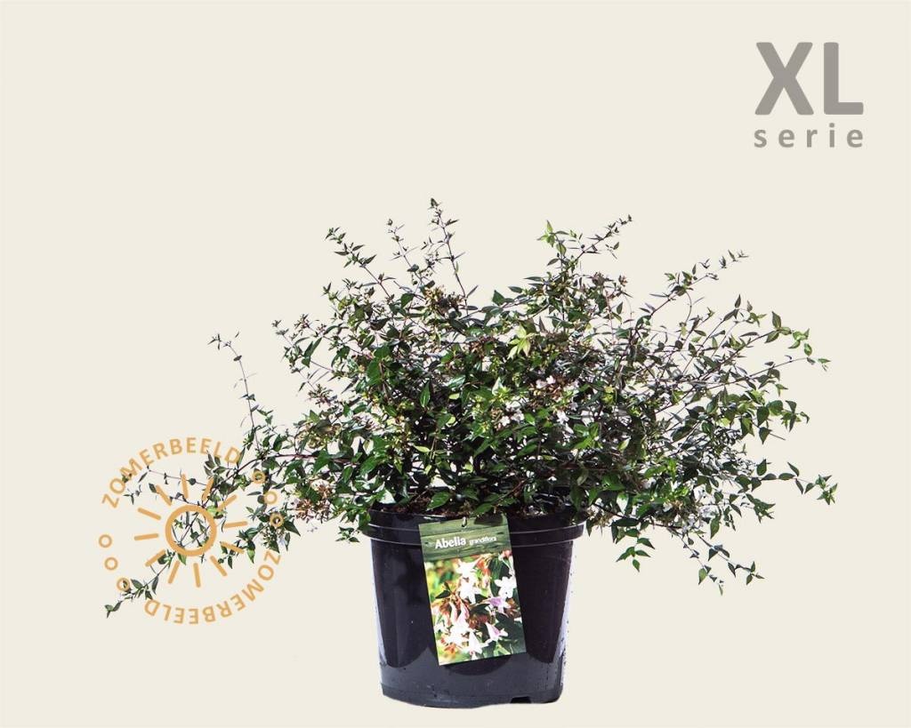 Abelia grandiflora XL is een langbloeiende heester. 'Grandiflora' is waarschijnlijk de meest populaire variant. Deze sierlijke tuinplant blijft half wintergroen. Het blad is glanzend donkergroen. Tijdens de bloei, van juni tot oktober, krijgt Albelia grandiflora bleek witroze, licht geurende, trompetachtige bloemen aan de gebogen takken. Hij staat mooi als solitair achterin een border of in kleine groepjes in een grotere border.