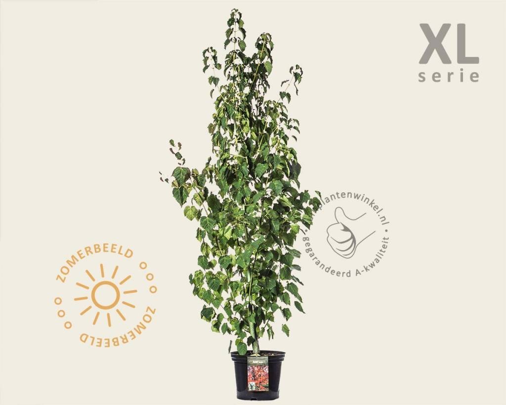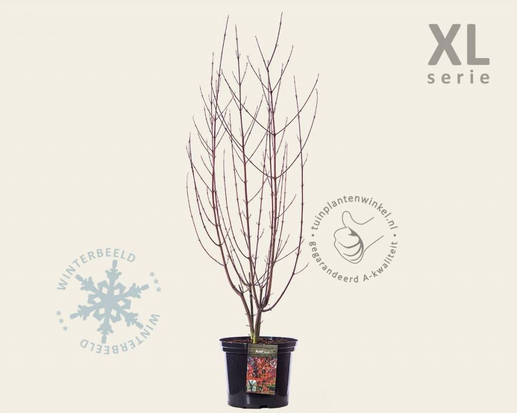 Acer davidii - XL is een sierlijke esdoorn, die oorspronkelijk uit China komt. Opvallend bij de tuinplant is de stam met de grijs-witte strepen, die in de lengte lopen en in de winter, wanneer de boom kaal is, heel mooi uitkomen. Daarbij hebben jonge takken een donker purper-rode kleur. De Chinese esdoorn krijgt een ronde kroon, met ovaalronde bladeren. In het najaar verkleuren die oranjerood. De bloemen vormen afhangende trossen met een lichtgele kleur. Zet Acer davidii - XL solitair in een border of in een gazon van wat grotere tuin of park.
