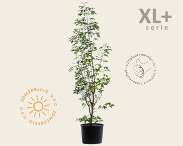 De Papieresdoorn in de XL+ uitvoering begint al het karakter te krijgen van een meerstammige boom. Acer griseum is een kleine, traag groeiende boomsoort die uitgroeit tot een hoogte van 3 tot 5 meter. De opvallende, afschilferende takken en bast zorgen ook in de wintermaanden voor een aantrekkelijk beeld. Deze Acer-variant is dan ook één van de mooiste esdoornsoorten. In het voorjaar verschijnt het, voor een Esdoorn zijnde, wat kleine en diep ingesneden blad. Het blad heeft in de zomer een groene kleur en verkleurt in het najaar vaak oranje of rood. Al deze eigenschappen zorgen ervoor dat de Acer griseum een prachtige tuinplant is.