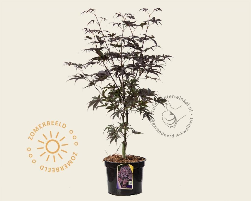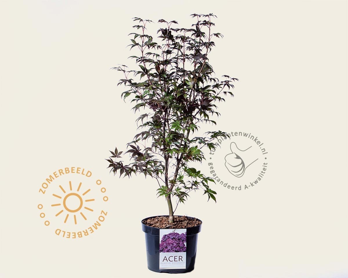 Acer palmatum 'Bloodgood' verschilt van de 'Atropurpureum' door zijn nog donkerder, paars gekleurde, diep ingesneden bladeren. Deze variant van de Japanse esdoorn is een meer opgaande vorm. Deze Acer word eigenlijk nooit als hoogstam boom verkocht dat zie wel bij de standaard Acer palmatum die groen is. De Acer is goed winterhard en groeit niet hard, maar toch kan een uiteindelijke hoogte van 2 tot 3 meter bereikt worden.