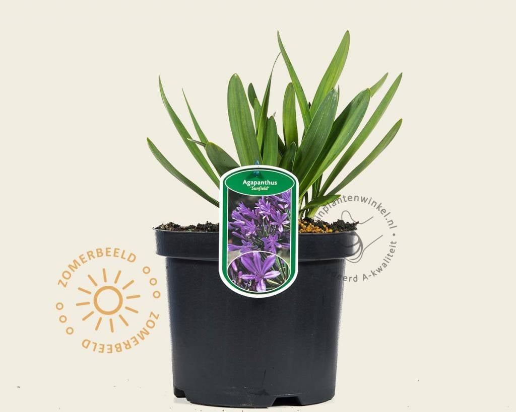 Agapanthus 'Sunfield' is een zeer decoratieve vaste plant. In juli krijgt de tuinplant grote kobaltblauwe bloemen op stevige stelen, die boven het donkergroene loof uitsteken. Naast de Nederlandse naam Afrikaanse lelie of Kaapse lelie, wordt er ook wel van liefdesbloem gesproken. Agapanthus 'Sunfield' staat prachtig tussen de andere vaste planten en is een aanrader voor de bloembak op het terras of balkon.