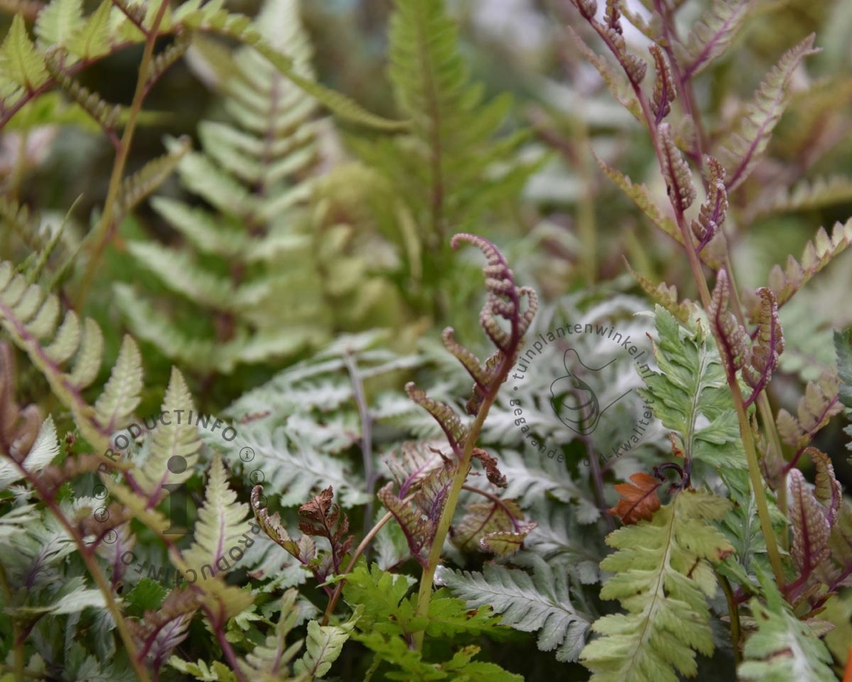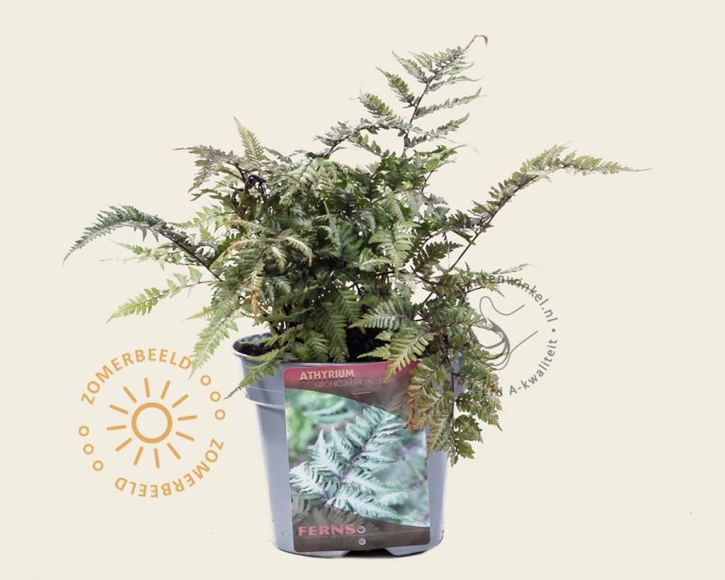 De varen Athyrium niponicum 'Metallicum' blijft niet wintergroen, maar is in het groeiseizoen misschien wel één van de kleurrijkste varen soort. De bladeren zijn zilvergroen van kleur. De nerf van het blad heeft afhankelijk van de standplaats een purperen of roodachtige gloed. Het is een mooie soort om te combineren met andere vaste planten zoals de blauwe Hosta 'Halcyon' of de bonte Hakonechloa macra 'Aureola'.