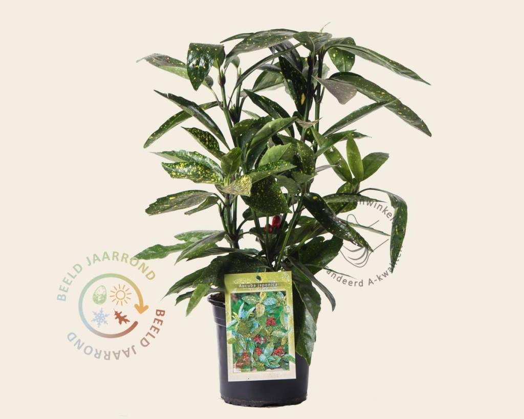 Aucuba japonica 'Variegata' wordt ook wel broodboom genoemd en is een bladhoudende heester met grote maar vooral decoratieve bladeren. De geel gespikkelde bladeren fleuren schaduwrijke hoekjes in de tuin mooi op. De vrouwelijke Aucuba bloeit in april - mei onopvallend met witte bloemen waar later in het jaar, als er een mannelijke plant in de buurt staat, rode bessen uit ontstaan. Deze groenblijvende struik kan tegen droogte, verdraagt zeewind, is goed winterhard en het blad en de besjes worden wel in kerststukjes verwerkt.