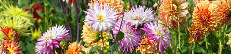 In deze border zijn verschillende soorten Dahlia's met vaste planten gecombineerd.