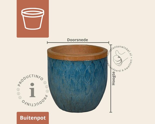 Deze pot is afgewerkt met een duurzame glazuurlaag, waardoor hij weerbestendig, onderhoudsarm en vorstbestendig is. De glazuur zorgt niet alleen voor bescherming, maar ook voor een rijke kleurbeleving die uw buitenruimte direct meer sfeer geeft.