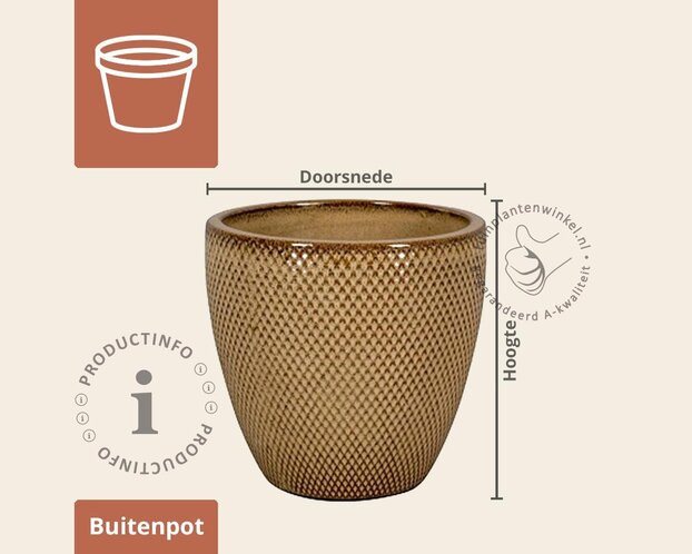 Dankzij de glazuurafwerking is deze bloempot weerbestendig, onderhoudsarm en vorstbestendig. Daarmee is de Busan uitstekend geschikt voor buitengebruik. De warme bruine kleur voegt direct sfeer toe aan uw terras of balkon en combineert prachtig met siergrassen, bloeiende vaste planten of een compact fruitboompje. Zo creëert u een natuurlijke en uitnodigende uitstraling in uw buitenruimte.