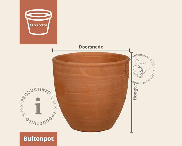 Dankzij de duurzame afwerking is deze bloempot weerbestendig, onderhoudsarm en vorstbestendig. Daarmee is de Corsica uitstekend geschikt voor buitengebruik. De warme terracottatint komt prachtig tot zijn recht op een terras of balkon en combineert mooi met siergrassen, bloeiende vaste planten of een compact fruitboompje. Zo creëert u een warme en mediterrane uitstraling in uw buitenruimte. De pot is voorzien van een afwateringsgat voor een goede waterafvoer.