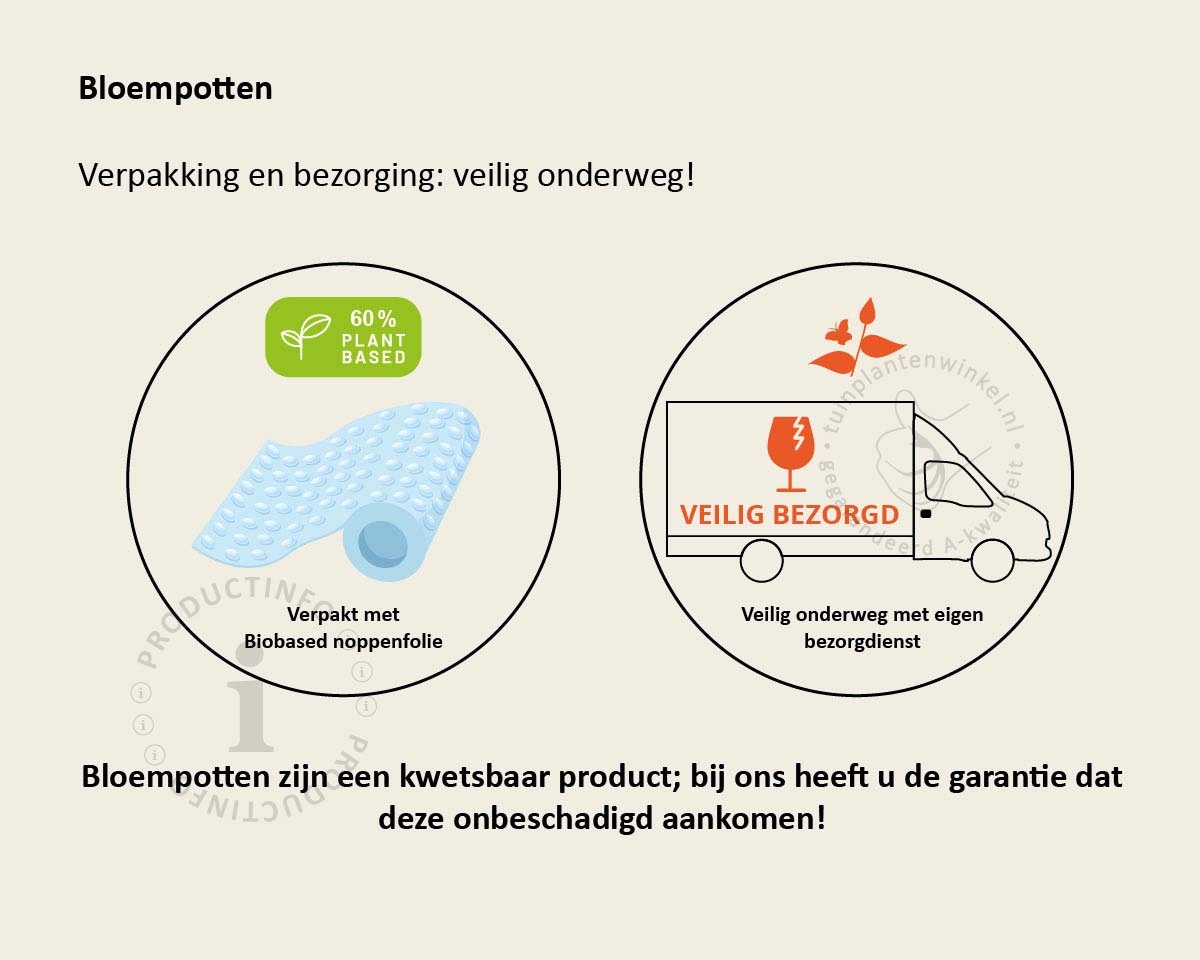 Wij verzorgen het transport zelf en verpakken iedere pot zorgvuldig, zodat deze veilig en onbeschadigd bij u aankomt. Wilt u direct aanplanten? Dan kunt u potgrond of hydrokorrels eenvoudig meebestellen. Wij leveren alles samen, zodat u niet apart met zware zakken hoeft te sjouwen.