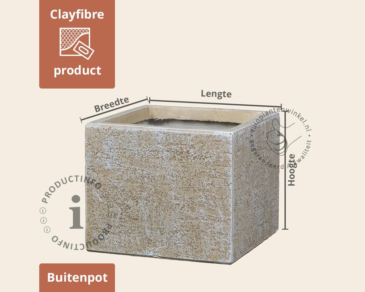 De vierkante vorm komt prachtig tot zijn recht langs een terrasrand, bij een entree of in een symmetrische opstelling. De lichtbruine tint combineert harmonieus met siergrassen, bloeiende vaste planten of een compacte fruitboom. Ook een kleine kruidentuin komt in deze pot mooi tot zijn recht. In de bodem is een opening aangebracht voor een goede waterafvoer.