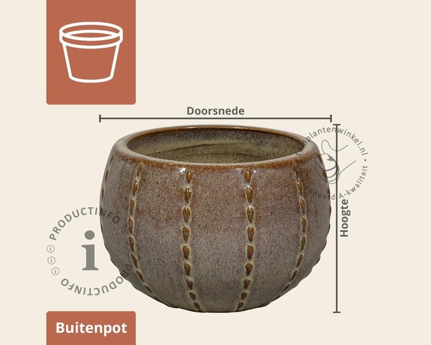 De Seoul 1-01 in Mokka Bruin is een geglazuurde bloempot met een warme en karaktervolle uitstraling. De lage, ronde vorm zorgt voor een krachtig silhouet, terwijl de subtiele verticale lijnen in het oppervlak extra detail geven. De diepe bruintint met lichte kleurnuances brengt warmte en past prachtig bij natuurlijke materialen zoals hout en terrastegels.