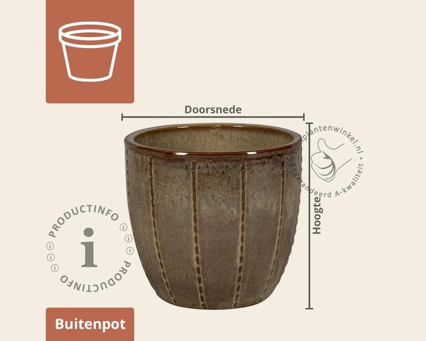 Deze pot is voorzien van een duurzame glazuurlaag, waardoor hij weerbestendig, onderhoudsarm en vorstbestendig is. De glazuur beschermt het keramiek tegen weersinvloeden en geeft de pot een rijke kleur met subtiele diepte.