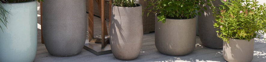Kunststof potten zijn licht van gewicht en onderhoudsarm, wat ze geschikt maakt voor grotere formaten of balkons. Clayfibre en andere lichtgewicht composieten combineren de uitstraling van beton met een lager gewicht, wat deze grotere potten ideaal maakt om ze toch eenvoudig verplaatsbaar te houden.