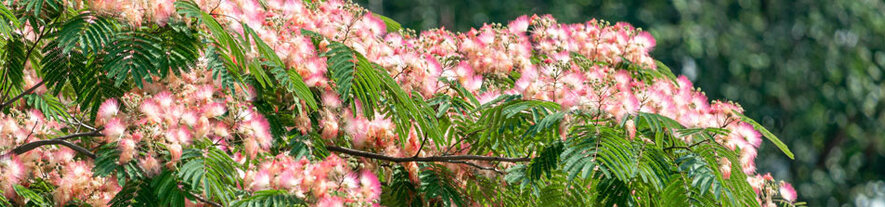 De Albizia boom valt op door zijn varenachtige bladeren, prachtige roze/paarse bloemen en opmerkelijke vermogen om zijn bladeren te sluiten als het regent of 's nachts.