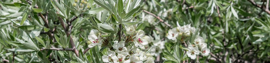 In het voorjaar zijn tussen het zilvergrijze blad kleine bundels met witte bloemen te ontwaren. Slechts heel af en toe groeit een enkele bloem uit tot een kleine peer die echter niet echt eetbaar zijn.