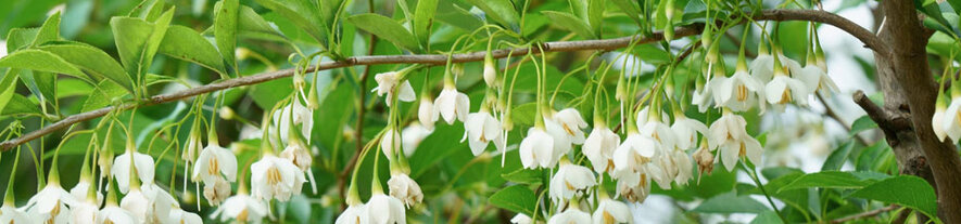 Styrax heeft mooie, vaak geurende bloemen die als sneeuwklokjes aan de takken hangen.