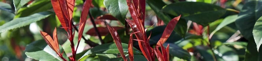 Photinia fraseri 'Red Robin' in vele vormen verkrijgbaar. Een bolboom op stam, als leiboom, dakboom of zoals u hier ziet in haagvorm.