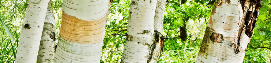 Meerstammige Zilverberken vallen op met hun witte stammen tussen het groen.