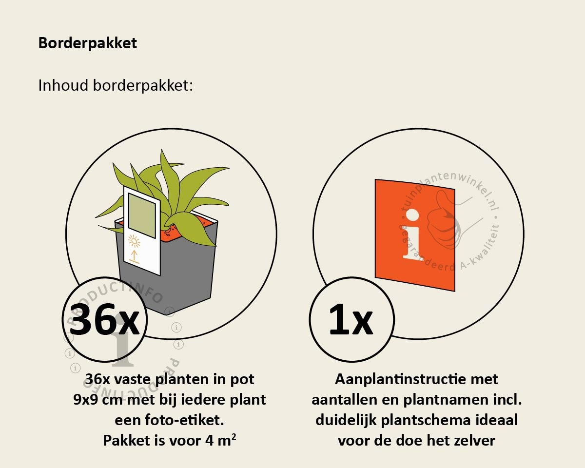 Onze borderpakketten zijn exclusief door Tuinplantenwinkel.nl zelf samengesteld en bestaan uit een collectie vaste planten en siergrassen voor een border van 4 vierkante meter. Alle planten in dit pakket worden geleverd met duidelijk foto-etiket.