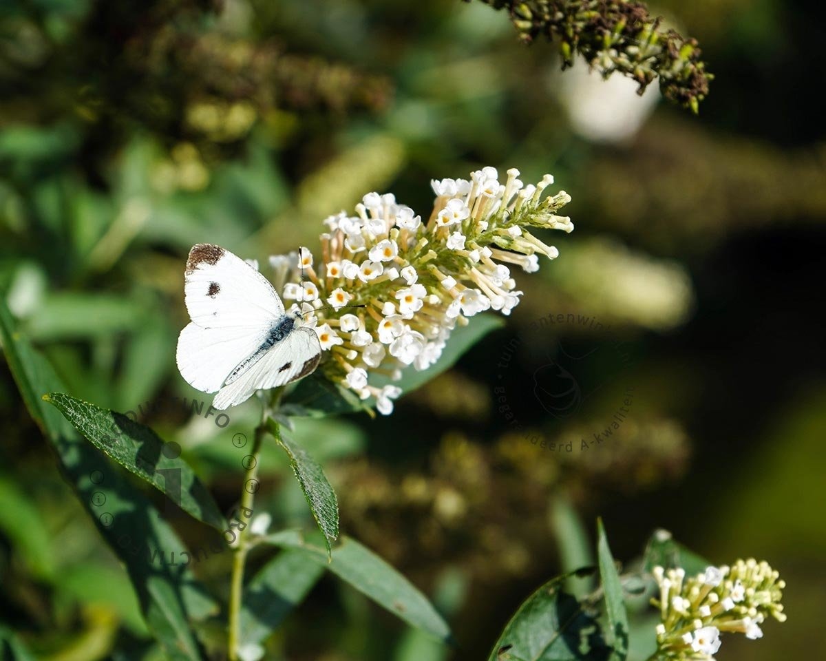 Antwoord: De Vlinderstruik, Buddleja 'White Chip' krijgt pluimvormige witte bloemen. De bloeitijd is juli september. De witte bloempluimen mogen nadat deze zijn uitgebloeid worden terug geknipt. Deze vlinderstruik hoort zeker thuis in een diervriendelijke tuin. De witte pluimen trekken namelijk veel vlinders en bijen aan. Een vlinderstuik staat graag in de zon.