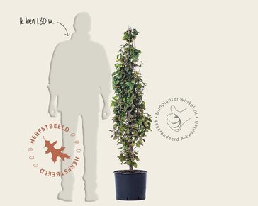 Monumentaal is deze Haagbeuk nog niet, maar met de uitstraling zit het wel goed. Carpinus betulus 'Monumentalis' is een compacte en gedrongen versie van de gewone haagbeuk. In tegenstelling tot haar grotere broer blijft de 'Monumentalis' klein en groeit de boom zeer traag. De kroon is kegelvormig waarbij de takken dicht opeen staan. In de zomer vormt de boom een dichte kroon. Het blad verkleurt in het najaar geel en valt daarna af. Ook in de winter is de Haagbeuk een fraaie verschijning, omdat het silhouet duidelijk zichtbaar is. Carpinus betulus 'Monumentalis' kan ongeveer 3 tot 4 meter hoog worden.