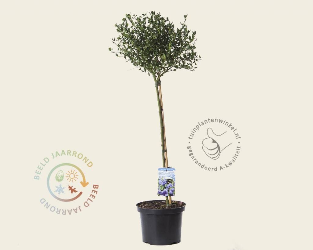 Dit is een op stam (van 60 cm) gekweekte Ceanothus impresssus 'Victoria'! Meestal zien we deze Amerikaanse sering als struik. De pluizige, diep blauwe bloemhoofdjes in mei en juni zijn een ware traktatie. Ideaal voor een kleine stadstuin waar het in de winter ook minder snel afkoelt. Ceanothus impressus 'Victoria' op stam is ook te gebruiken als kuipplant.
