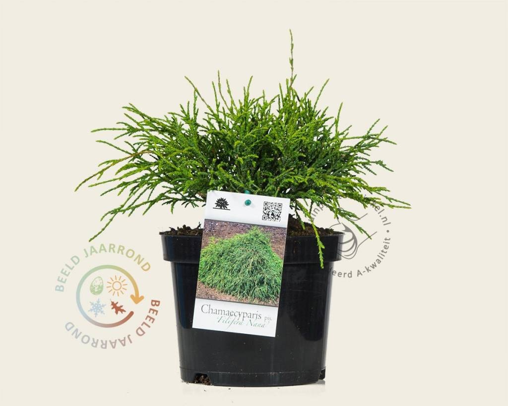 Chamaecyparis pisifera 'Filifera Nana' is een laagblijvende dwergsoort met mooie, dunne twijgen. Met zijn breed uitgroeiende, wat afgeplatte bolvorm is deze tuinplant geschikt als solitair, ook in de kleine border en in de rotstuin. De naaldvormige bladeren zijn frisgroen en blijven in de winter aan de Schijncipres, die goed winterhard is.