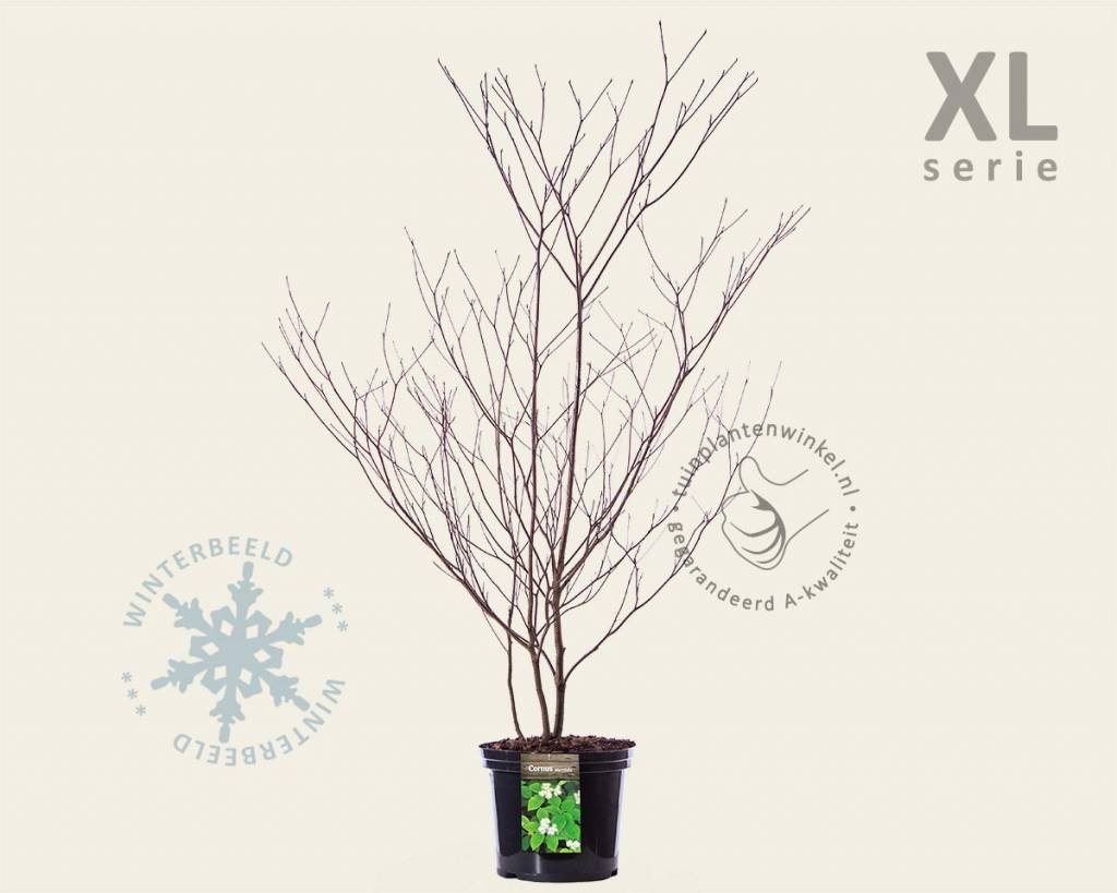 Cornus alternifolia - XL is een vrij langzaam groeiende Cornus, die als solitair het best tot zijn recht komt. De kroon van deze kleine boom wordt eerst piramidevormig en later meer rond. De horizontale takken staan in etages op de stam. De bladeren zijn donkergroen met een blauwachtige onderzijde. In de herfst kleuren die paarsrood. Laat in het voorjaar veschijnen er opstaande platte tuilen van roomwitte bloemetjes, waar later in de herfst kleine, blauwzwarte bessen op rode steeltjes voor in de plaats komen. De tuinplant is een kleinere versie van en nauw verwant aan de Cornus controversa.