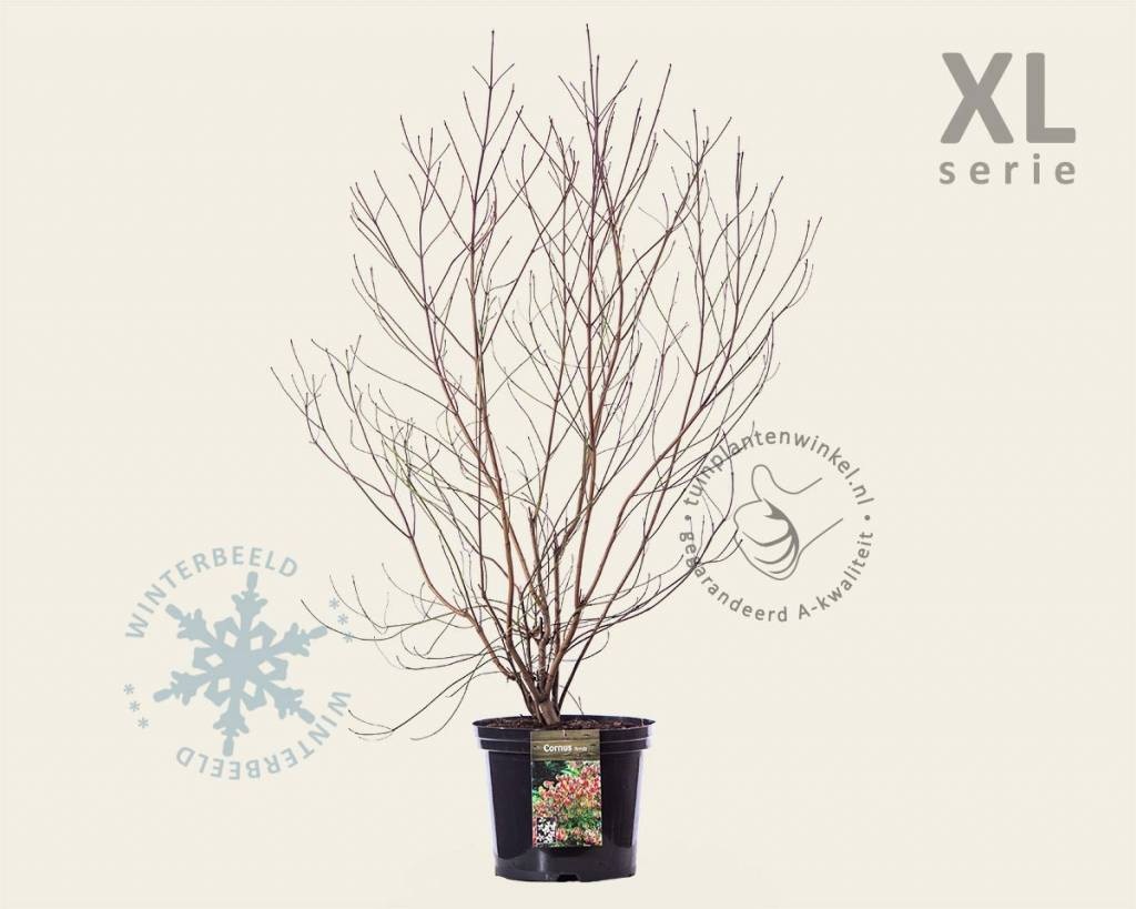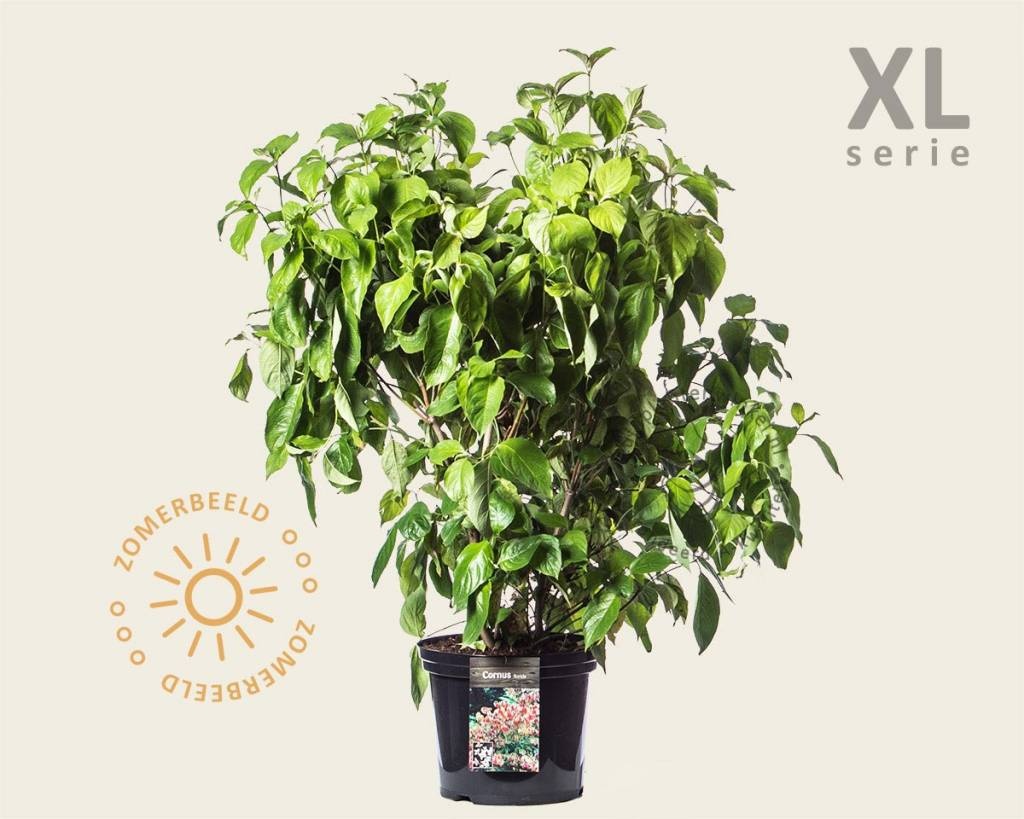 Cornus florida - XL is een mooie heester of kleine boom. In het voorjaar tooit de tuinplant zich met witte bloemen, die later uitgroeien tot rode bessen, die lang blijven hangen. De Amerikaanse kornoelje heeft een uitgesproken groeivorm: eerst opgaand en daarna breder uitgroeiend. Cornus florida bloeit eerder dan Cornus kousa en kunnen daarom mooi gecombineerd worden. Amerikaanse kornoelje heeft glanzende, groene bladeren die in de herfst oranje-rood verkleuren en daarna afvallen. De tuinplant komt het best tot zijn recht als solitair in de grotere tuinen en gazonnen.