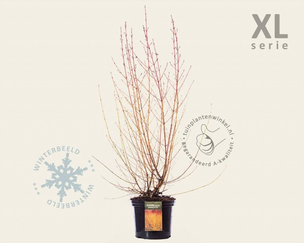 Cornus sanguinea 'Midwinter Fire' - XL is bij uitstek geschikt voor de kleinere tuin. Hij staat ook mooi als haag. De struik blijft kleiner dan haar nichtjes en neefjes. In het voorjaar krijgt Rode kornoelje frisgroene bladeren. De opvallende oranjerode twijgen in de winter zijn dé grote sierwaarde. Hoe zonniger de standplaats des te roder de takken, maar in de halfschaduw gedijt de tuinplant ook prima. De witte bloesem is onopvallend, maar lichtgeurend en het blad kleurt geel/oranje af in de herfst.