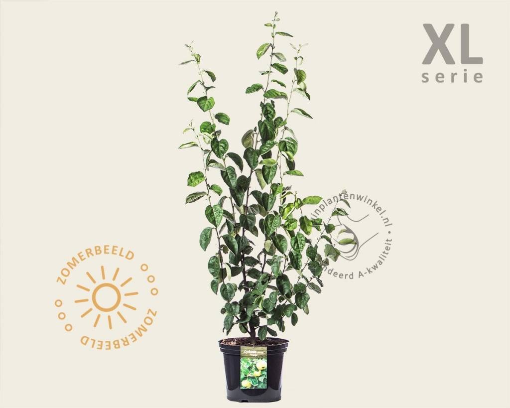 Cydonia oblonga 'Vranja' - XL krijgt zeer grote vruchten. De vruchten van de Kweepeer zijn geurend en kunnen zonder bereiding niet gegeten worden. De vruchten, die in oktober rijp zijn, kunnen worden gebruikt in compote, gelei en taarten. Kweeperen zijn ook leuk om binnen in huis als decoratie neer te leggen. Cydonia oblonga 'Vranja' is een bladverliezende tuinplant. De Kweepeer bloeit in mei met witte bloemen, die zelfbestuivend zijn. De boom heeft een compacte groeiwijze en is hierdoor prima geschikt voor de kleinere tuin; ook komt hij goed tot zijn recht in een fruit- of groentetuin.