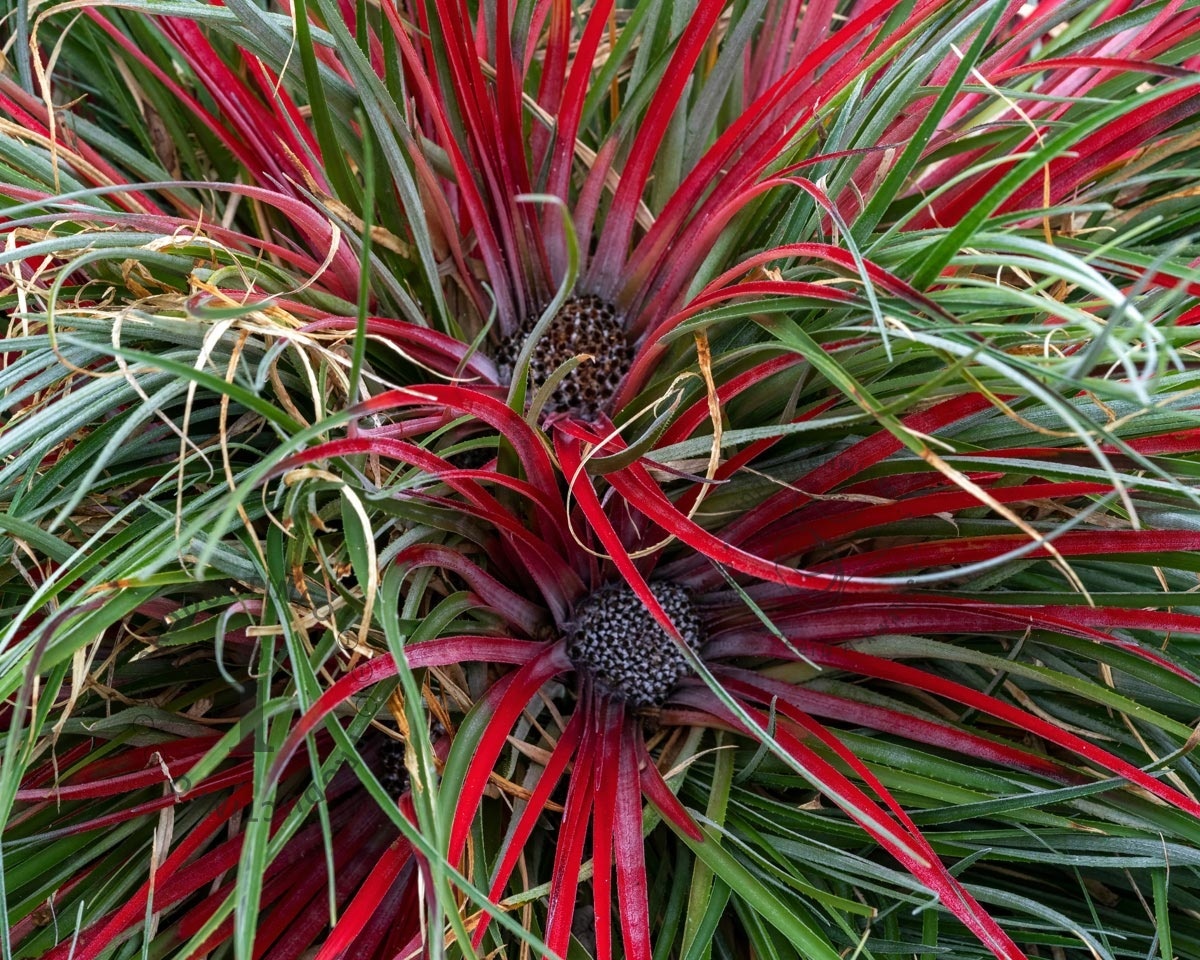 Fascicularia bicolor is geen alledaagse plant. De vrij harde, blauwgrijze bladeren zijn smal en hebben een soort weerhaakjes aan de rand. De binnenste bladeren verkleuren gedurende zomer en in de herfst rood. In het hart van dat rode rozet vormen zich in augustus tot september roodblauwe bloemen; de bloei is vrij kort, maar de rode kleur van de bladeren blijft, ook in de winter.