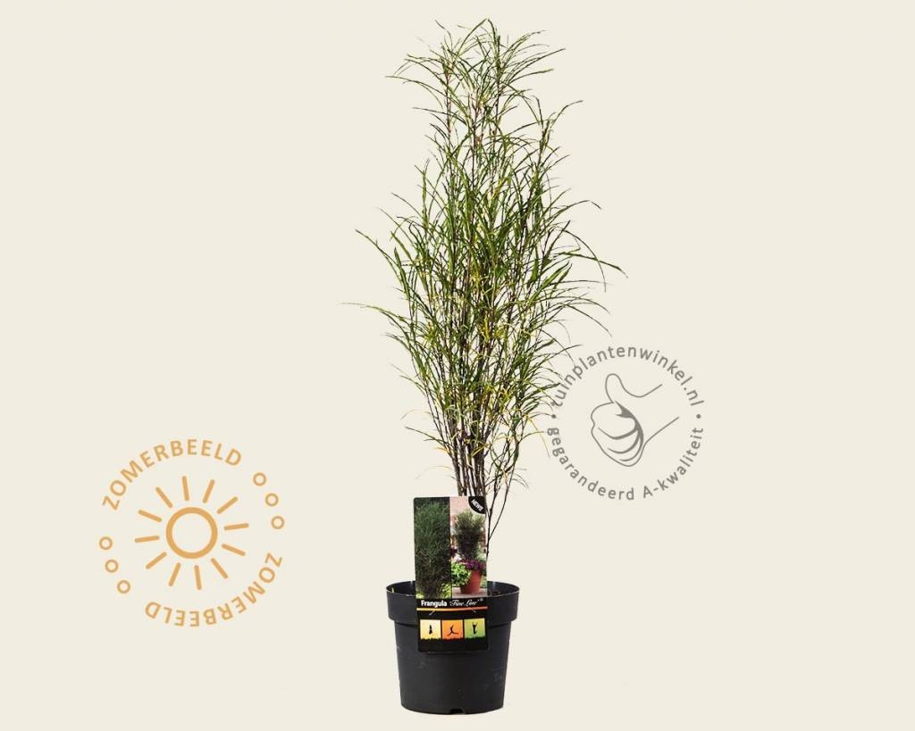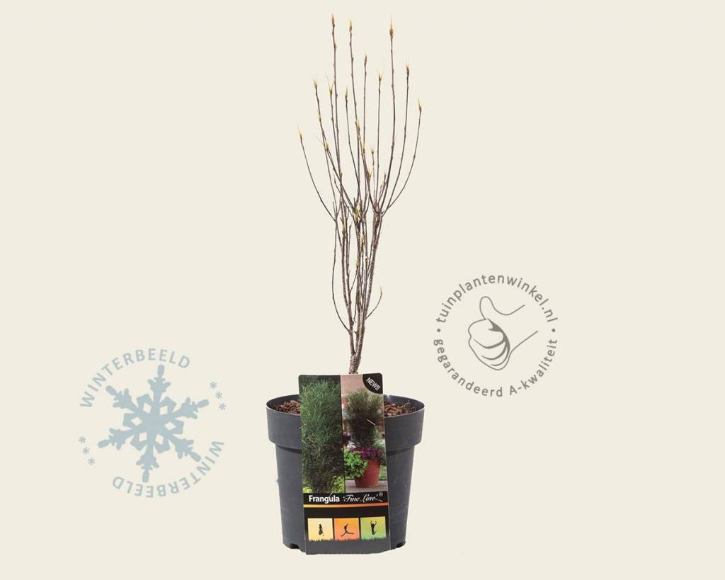 De Frangula alnus 'Fine Line' is een kleine boom met een smalle opgaande groeiwijze. Deze vorm zorgt er oor dat hij maar weinig ruimte nodig heeft om te groeien. Het glanzende, lichtgroene blad is zeer smal en kleurt in de herfst geel. De bloemen van deze Frangula alnus zijn crèmekleurig en vallen niet zo op, maar er komen wel bijen op af. Na de bloei vormen zich rode bessen, die later zwart verkleuren. De bloei is in mei - juni. De Vuilboom is goed toe te passen in elke tuin, maar ook in groenstroken in openbaar groen samen met andere landschappelijke elementen. De struik kan goed tegen droogte en is prima winterhard. Vuilboom kopen? Dan ben je bij Tuinplantenwinkel op de juiste plek.