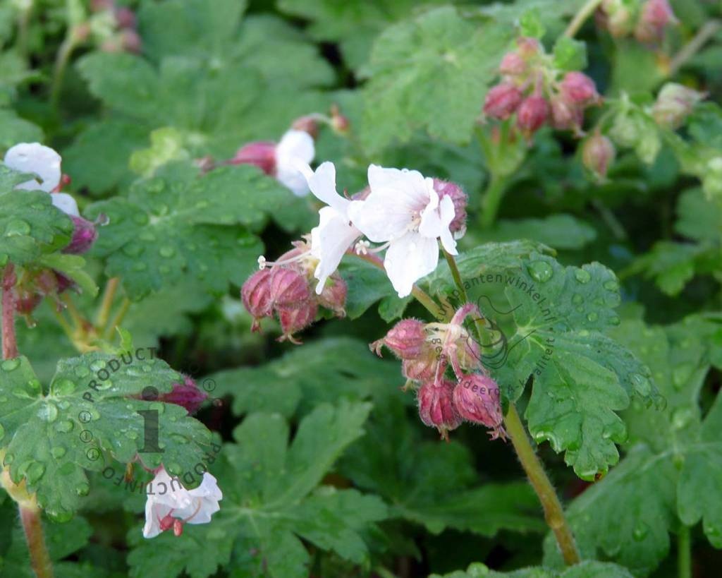 Geranium macrorrhizum 'Spessart' is een mooie, wollig groeiende, vaste plant met witte bloemen met een rode kelk. Het groene blad is diep ingesneden en kleverig. Bij aanraking komt er een aromatische geur vrij. De tuinplant is wintergroen in zachte winters; het blad kleurt dan rood in de herfst en winter. Ooievaarsbek is heel geschikt als bodembedekker onder struiken en bomen. De tuinplant breidt zich met zijn ondergrondse wortelstokken snel in de breedte uit tot een dicht tapijt. Binnen de kortste keren heeft onkruid geen kans meer.
