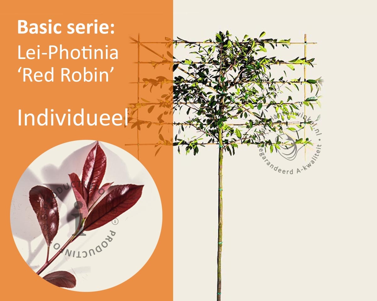 De Glansmispel leiboom - Rek is een kleurrijk, groenblijvend leischerm. Het rek zorgt voor een dicht gegroeid scherm dat direct privacy en beschutting biedt. De glansmispel valt op door het frisse, glanzend groene blad en de jonge uitlopers die in het voorjaar helder bruinrood uitlopen. In mei en juni bloeit de plant met kleine, witte bloemen die bijen en andere bestuivers aantrekken, gevolgd door bessen die van rood naar zwart verkleuren. In lei-vorm op rek ontstaat een dichte, groene wand die bescherming biedt tegen wind, privacy biedt en schaduw geeft. De Glansmispel geeft het hele jaar door een fraaie uitstraling, dankzij de groenblijvende bladeren. De bladeren verkleuren in de herfst, waardoor het scherm ook dan een decoratief effect heeft. De glansmispel leiboom is winterhard tot -15 graden Celsius, Met een gemiddelde groeisnelheid van 30-60 cm per jaar is deze leiboom geschikt voor zowel kleine tuinen als grotere tuinen. De Photinia fraseri 'Red Robin' kan in pot geleverd worden en kan het gehele jaar geplant kan worden. Voor een optimale groei adviseren wij een zonnige plek of volle zon met voldoende zonlicht. Snoei in het voorjaar en de zomer helpt om de lei-vorm te behouden en stimuleert de groei van nieuwe rode bladeren; jonge planten kunnen vaker gesnoeid worden voor een vollere groei. Gebruik bij het aanplanten boompalen voor extra stevigheid en let op voor mogelijke vorstschade bij strenge vorst, vooral op winderige plekken, mogelijk dat de plant dan blad laat vallen. Deze plant is ideaal voor het creëren van privacy, schaduw en een kleurrijk accent in zowel kleine als grote tuinen.