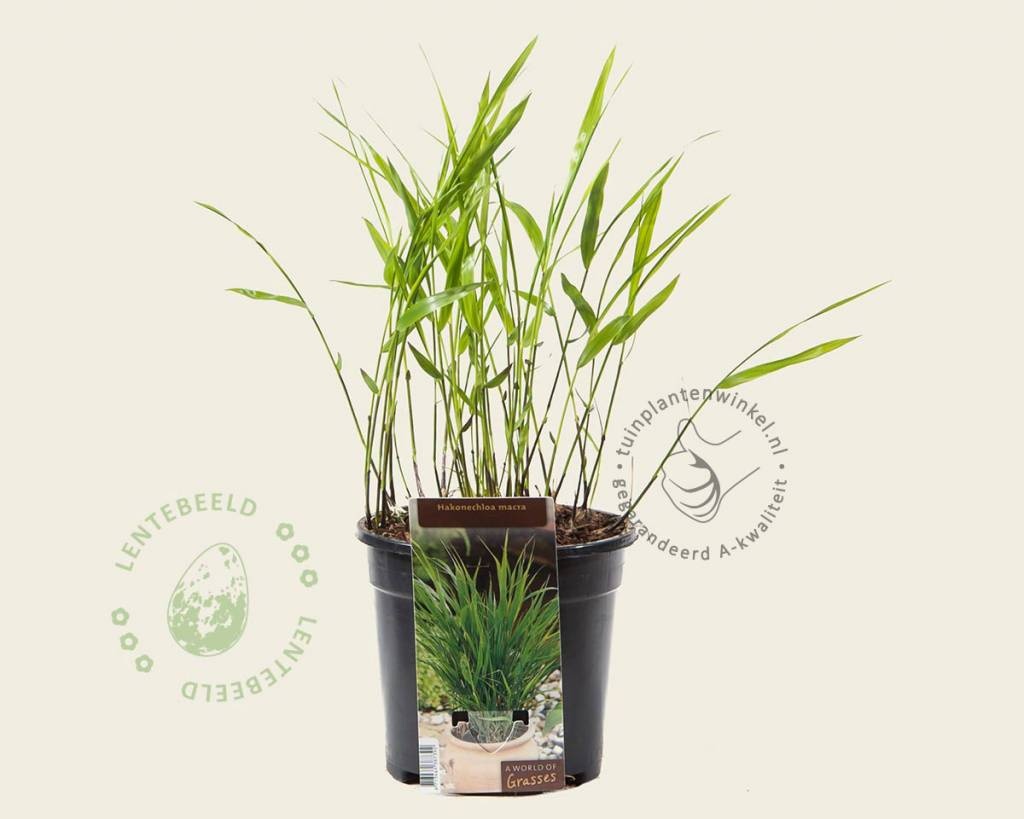 Hakonechloa macra is een bijzondere grassoort met frisgroene, bamboeachtige, overhangend blad.. In het najaar verkleurt het blad van dit siergras naar roodbruin. Japans berggras is geen bamboe en woekert dus niet. Japans siergras is goed winterhard en staat mooi als rand langs of als groep in de border, waar de afzonderlijke pollen langzaam een geheel vormen, maar voldoet ook uitstekend als solitair in een pot op het balkon of terras. De uiteindelijke hoogte ligt tussen de 20 en 40 centimeter. Japans siergras kun je goed combineren met andere vaste planten. Hakonechloa macra japans is een snelle groeier en vormt nieuwe scheuten