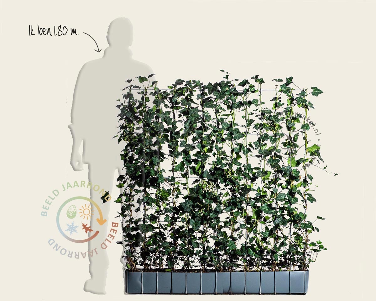 Hedera hibernica is een sterke, winterharde en wintergroene klimop, ook wel bekend als Ierse klimop, die razendsnel groeit en een dichte, donkergroene wand vormt. Hedera hagen zijn populair omdat ze door hun snelle groei, wintergroene karakter en aanpassingsvermogen in bijna iedere tuin passen. In deze kant en klaar hagen, zoals quickhedge, mobilane kant of hedera kant, is de klimop al volledig volgroeid op een metalen raster, waardoor het product direct privacy biedt, zonder het gedoe van losse planten. Deze klare hagen zijn onderhoudsarm, hebben weinig water nodig en kunnen eenvoudig tegen een muur geplaatst worden. Zoek je een klaar haag Hedera die direct resultaat geeft? Dan zijn deze kant en klaar hagen ideaal: ze dragen bovendien bij aan het vergroenen van stedelijke gebieden en stimuleren een gezonde omgeving.