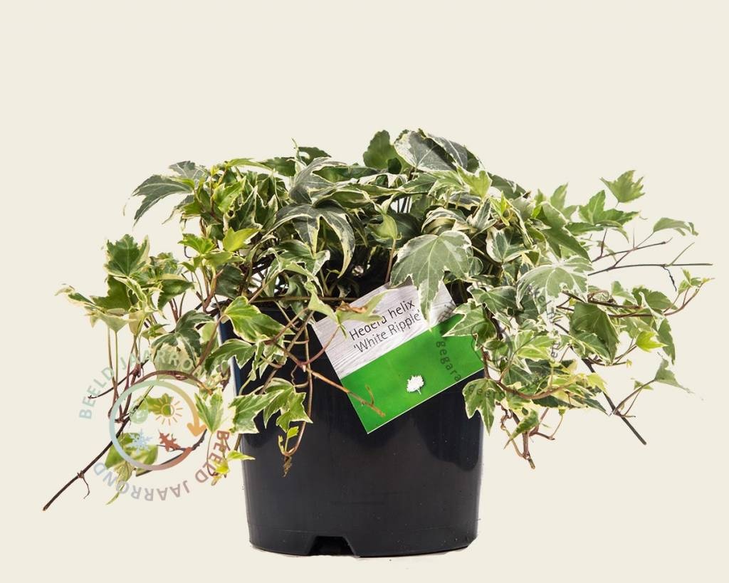 Hedera helix 'White Ripple' is een fijnbladige, zelfhechtende en groenblijvende klimplant. Deze bonte Klimop heeft lichtgroene bladeren met witte nerven en een witte rand, die wat puntig van vorm zijn. Het is een zeer sterke tuinplant die prima als bodembedekker of als klimplant tegen een muur te gebruiken is, maar ook aan de randen van bloembakken tussen andere planten mooi zal staan.
