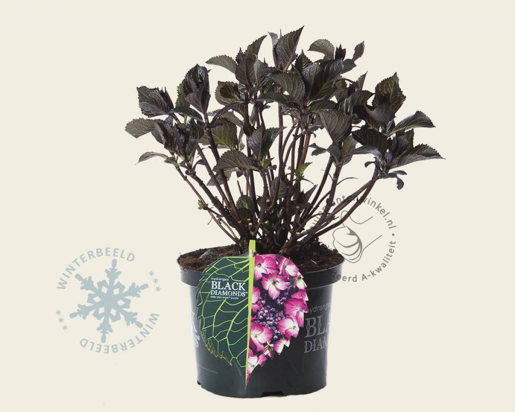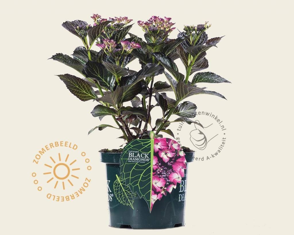 Hydrangea 'Dark Angel Purple' is een hortensia met een schermvormige bloeiwijze (Teller). Deze soort valt op door zijn paarskleurige bladeren. De groene aders komen hier prachtig in uit en geven de tuinplant een bijna mystieke uitstraling. Daarnaast is de bloemkleur perfect afgestemd op de bladkleuren, waardoor de Schermhortensia een parel in uw tuin zal zijn! Probeer hem ook eens in een bloembak op uw terras.