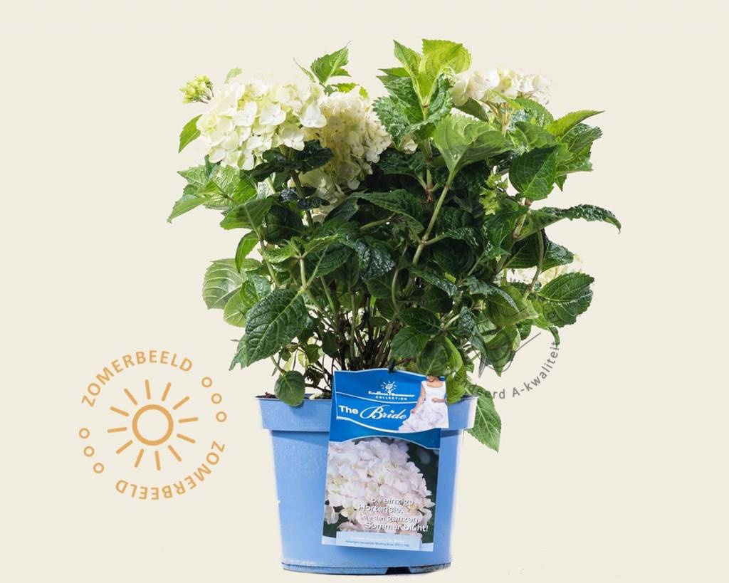 Hydrangea macrophylla 'Endless Summer The Bride' is een Amerikaanse cultivar en wordt onder licentie gekweekt. Hij heeft de mooie eigenschap, dat het een doorbloeiende hortensia is. Deze tuinplant maakt steeds nieuwe knoppen, waardoor hij een langere bloeitijd heeft dan gewone hortensia's. De bloemen verschijnen daarnaast ook op de nieuwe scheuten. Klassieke boerenhortensia's bloeien alleen op het tweejarig hout.