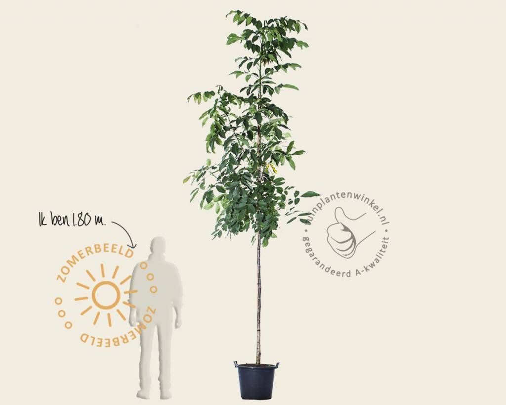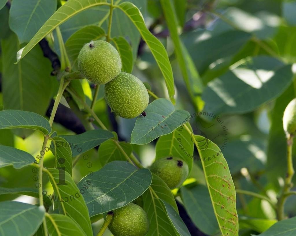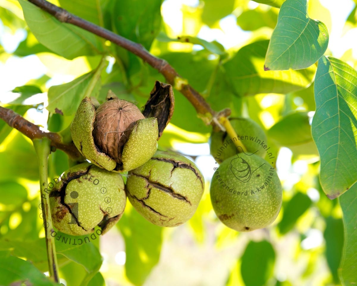 De Juglans regia is een gewone Notenboom of Walnoot. Een notenboom weert vliegen en andere insecten van uw terras. Let op; het kan enkele jaren duren voordat u noten kunt oogsten. Geef hem de tijd. In het voorjaar bloeit een volwassen boom met zwart-groene slierten die vrij snel afvallen. Bestuiving gebeurt door middel van pollen die zich met de wind mee laten voeren. In het najaar zijn de vruchten rijp waarna ze van de boom vallen. Een notenboom is goed winterhard.