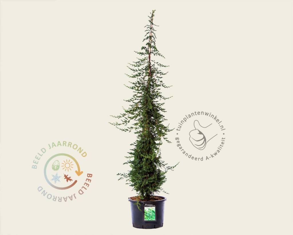 Juniperus conferta 'Blue Pacific' is wintergroen met blauwgrijze naalden, die dicht op elkaar staan. Met behulp van een bamboestok is de Jeneverbes omhoog geleid; uit zichzelf zou de tuinplant breed uitgroeiend laag bij de grond blijven. Dez tuinplant is niet veeleisend, kan goed tegen hitte, droogte, wind, koude en vorst. Hij is geschikt voor de kust en in duingebieden. Als solitaire tuinplant zeker een aanrader ook voor de kleinere tuin.