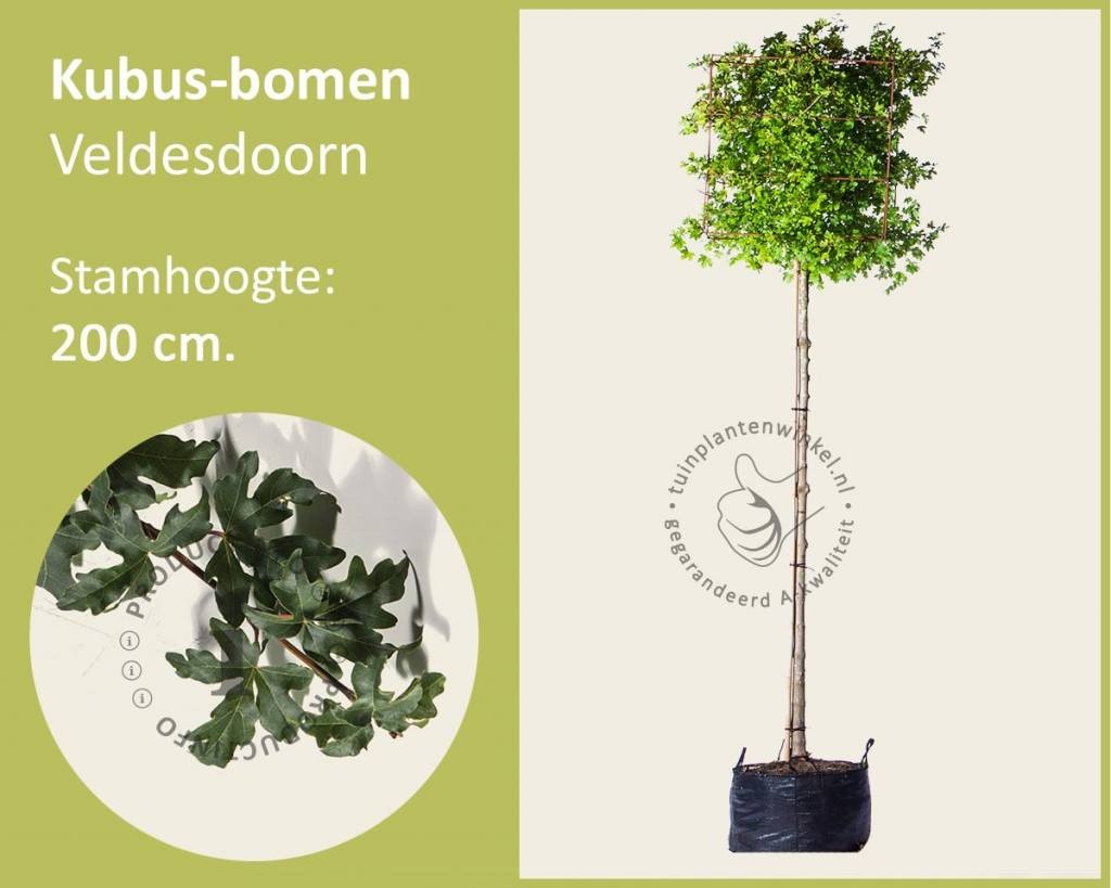 De Kubus-boom heeft een kleiner formaat en is ook prima toepasbaar in kleinere tuinen. De Veldesdoorn of Acer campestre laat zich prima snoeien; je ziet deze soort ook wel eens als haag of leiboom. Het blad is wat kleiner en verkleurd in het najaar prachtig geel.