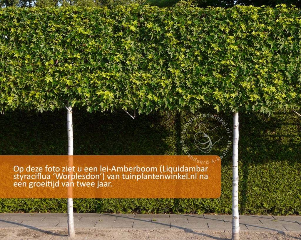 De Lei-Amberboom is een topper uit ons leibomenassortiment. Deze leiboom heeft een decoratief, handvormig blad, dat in de herfst schitterend verkleurt in allerlei geel- en roodtinten. De Lei-Amberboom oftewel Lei-Liquidambar of Leiliquidambar is, met zijn grote handvormige blad, een zeer goed alternatief voor de leivorm van de Plataan. De bladeren van de selectie 'Worplesdon' zijn wat fijner en dieper ingesneden en de stam blijft gewoon glad. De 'Worplesdon' is de beste variant van de Liquidambar om een leiboom van te maken.