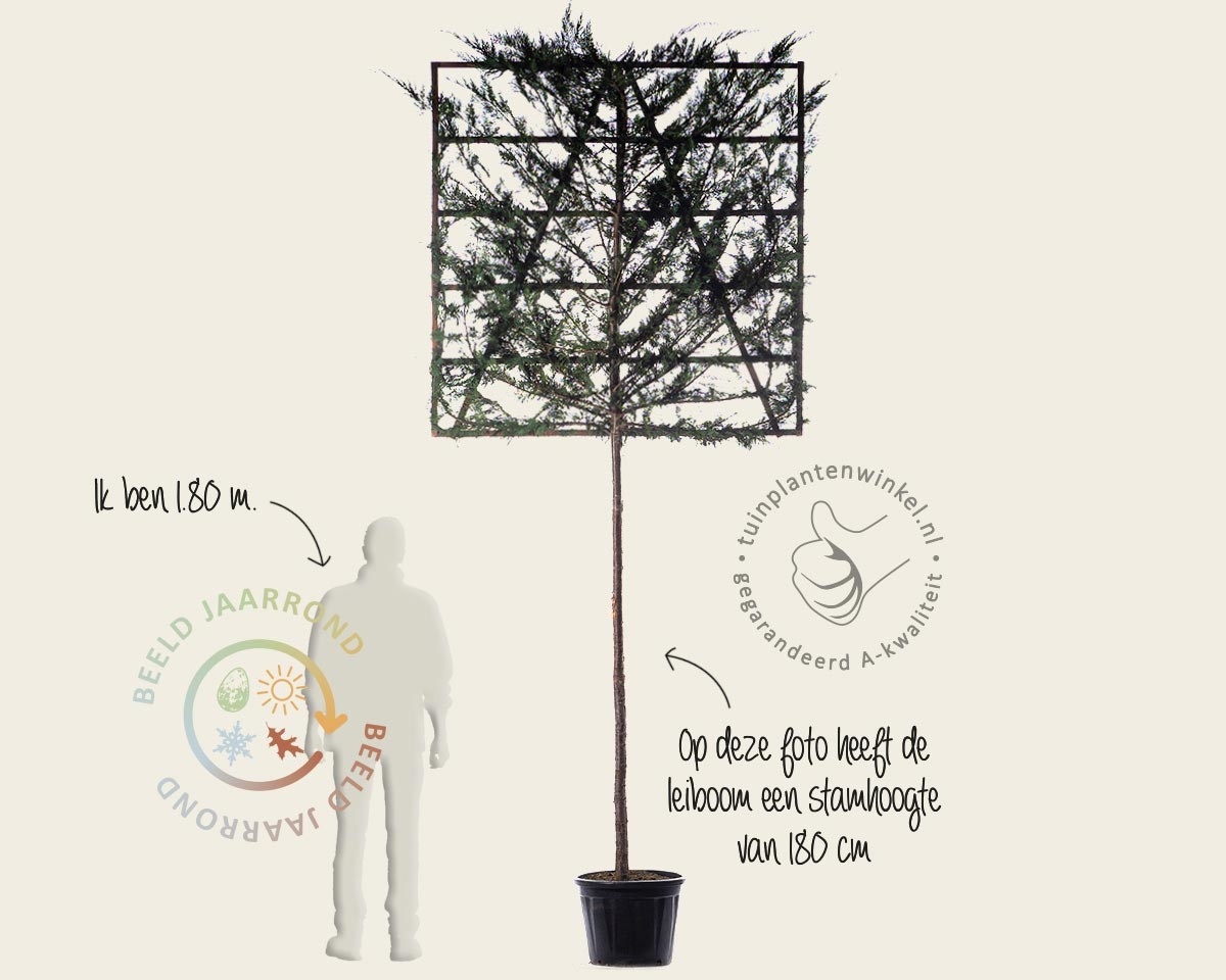 Ons advies is om de rekken van de Lei-Conifeer 'Leylandii' - 150 maximaal 60 centimeter uit elkaar te plaatsen. Door de rekken van de leibomen aan elkaar te koppelen ontstaat een sterk geheel en kunt u de takken van de leibomen naar elkaar toe laten groeien. Een alternatief voor de Lei-Conifeer 'Leylandii' is de Lei-Conifeer 'Excelsa'. Deze heeft een wat groenere aanblik door de meer groene naalden. De groeisnelheid van een Lei-Conifeer 'Leylandii' is ongeveer gelijk aan die van de Lei-Conifeer 'Excelsa'.