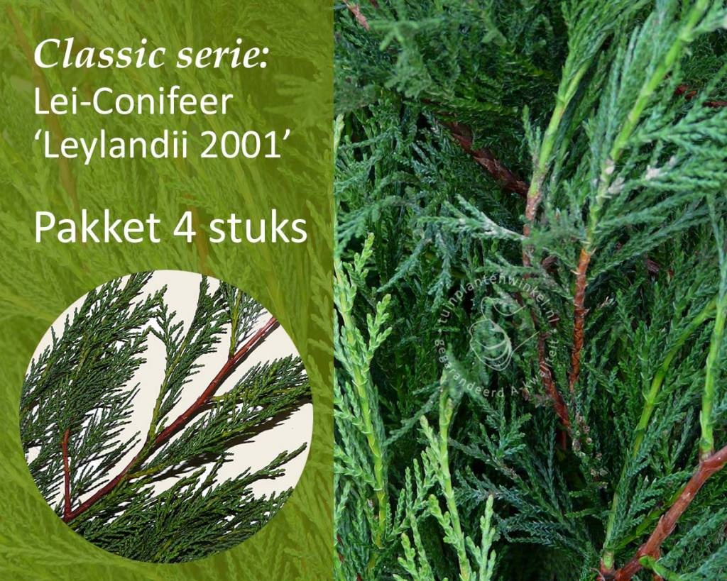 Lei-Cupressocyparis leylandii '2001' of Leylandcipres is kampioen in het maken van wintergroene afscheidingen. Deze groenblijvende Lei-Conifeer groeit snel en mooi dicht van structuur. De kleur van de schubbladeren van de Lei-Cupressocyparis leylandii '2001' is donker grijsgroen. De Leylandcipres heeft een fijnere structuur dan de meeste andere coniferen. De tuinplant krijgt daardoor een bijzondere uitstraling.