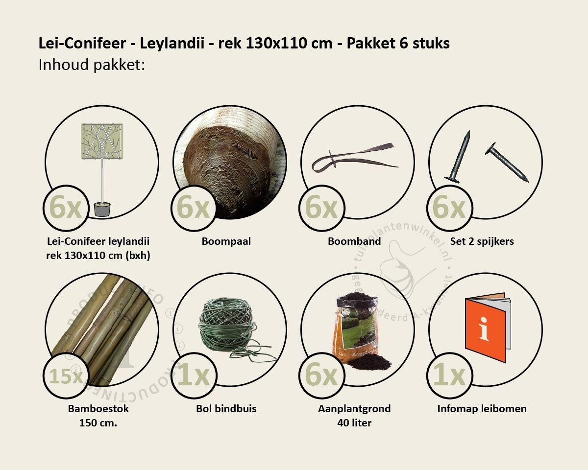 Ons advies is om de rekken van de Lei-Conifeer 'Leylandii' maximaal 60 centimeter uit elkaar te plaatsen. Door de rekken van de leibomen aan elkaar te koppelen ontstaat een sterk geheel en kunt u de takken van de leibomen naar elkaar toe laten groeien.
