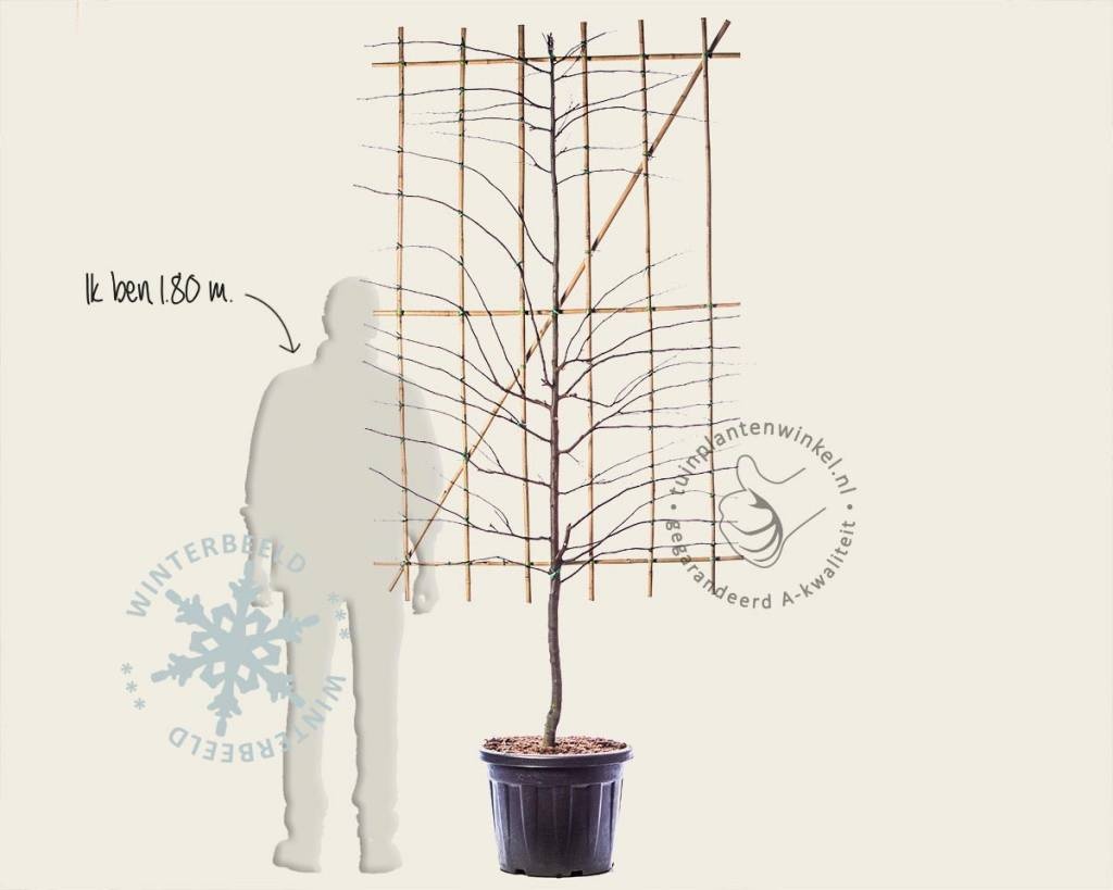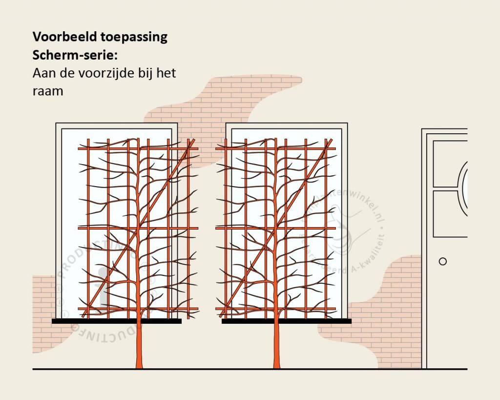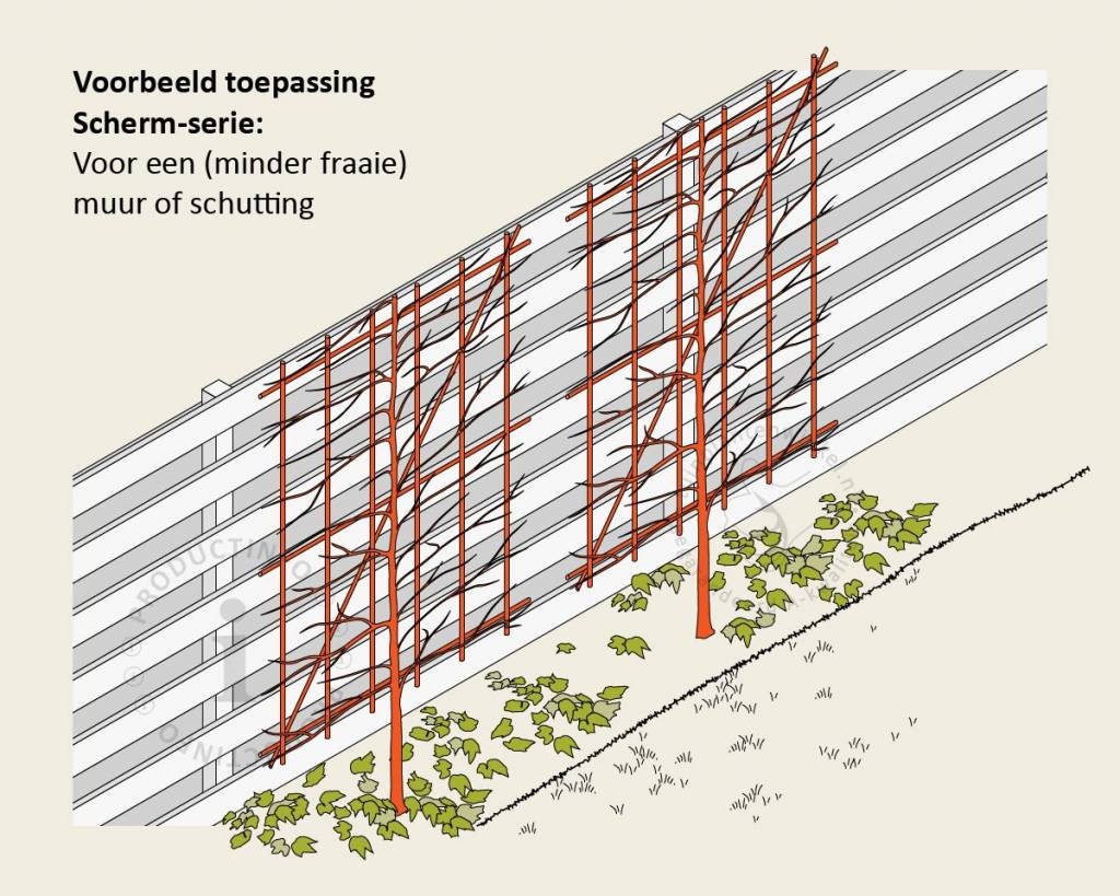 Deze Lei-scherm uitvoering kan worden gebruikt om kamers in uw tuin te creëeren, een muur of schutting te camoufleren of juist om het zicht af te blokken vanaf de straatzijde. De boom heeft een korte stam van 50 centimeter met daarboven een scherm van 120 x 180 centimeter. Het frame kan worden vergroot door parallel extra bamboestokken aan te binden. U kunt de kluit van de boom tegen de schutting aan plaatsen maar bij voorkeur plaatst u de stam op een afstand van minimaal 40 à 50 centimeter of meer.