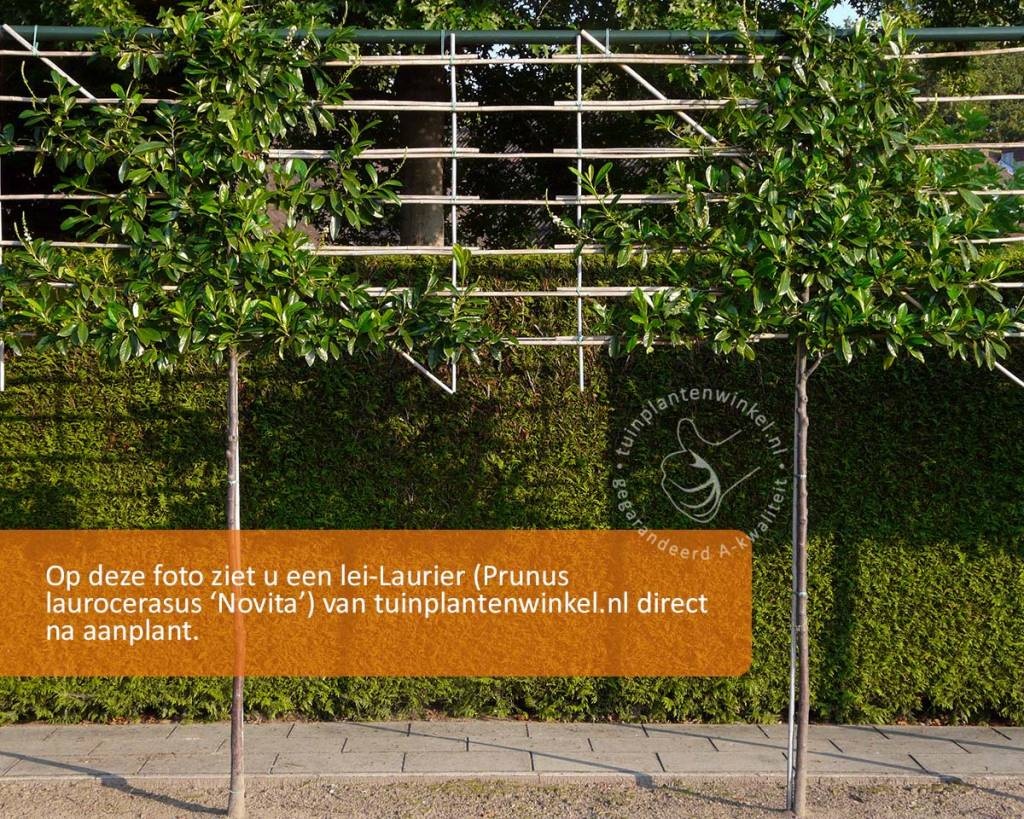 De Lei-Laurier is een groenblijvende leiboom. De boom heeft mooi glanzend en langwerpig blad dat iets breder is dan bij de soortgenoot 'Caucasica'. Lei-Prunus laurocerasus 'Novita' bloeit in het voorjaar met staande witte, kaarsvormige bloemtrossen, vaak gevolgd door zwarte bessen. Groenblijvende leibomen bieden het hele jaar rond maximale privacy, maar stellen wat meer eisen aan hun standplaats dan een gemiddelde bladverliezende leiboom.