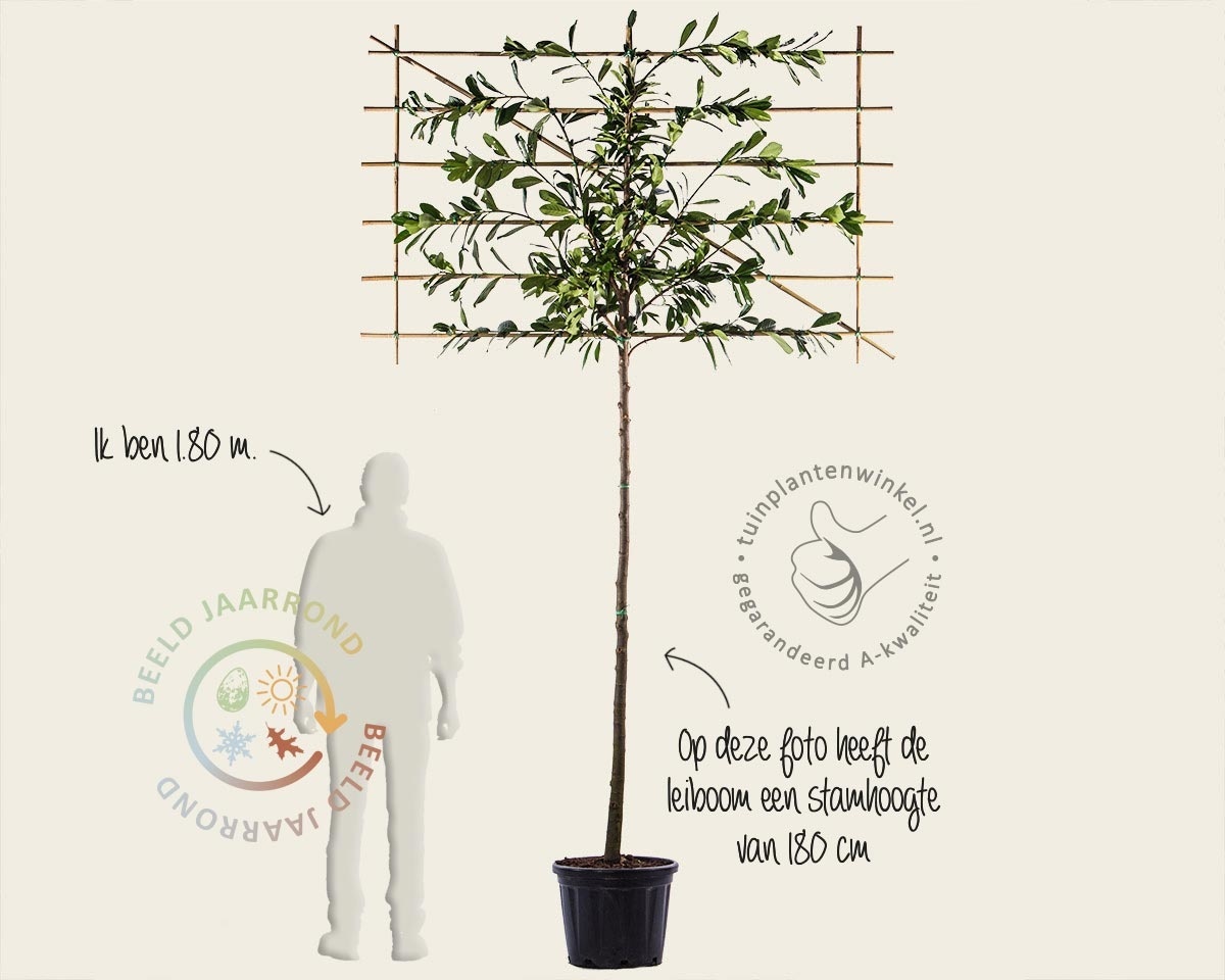 Lei-Prunus laurocerasus 'Novita' uit de Basic-serie heeft een scherm van 180 x 110 centimeter (bxh) groot. De stamhoogte is afhankelijk van uw keuze. Doorgaans zijn deze leibomen leverbaar met één stamhoogte. De hoogte kan per seizoen verschillen. Is uw gewenste stamhoogte niet leverbaar? Neem dan gerust contact met ons op via e-mail.