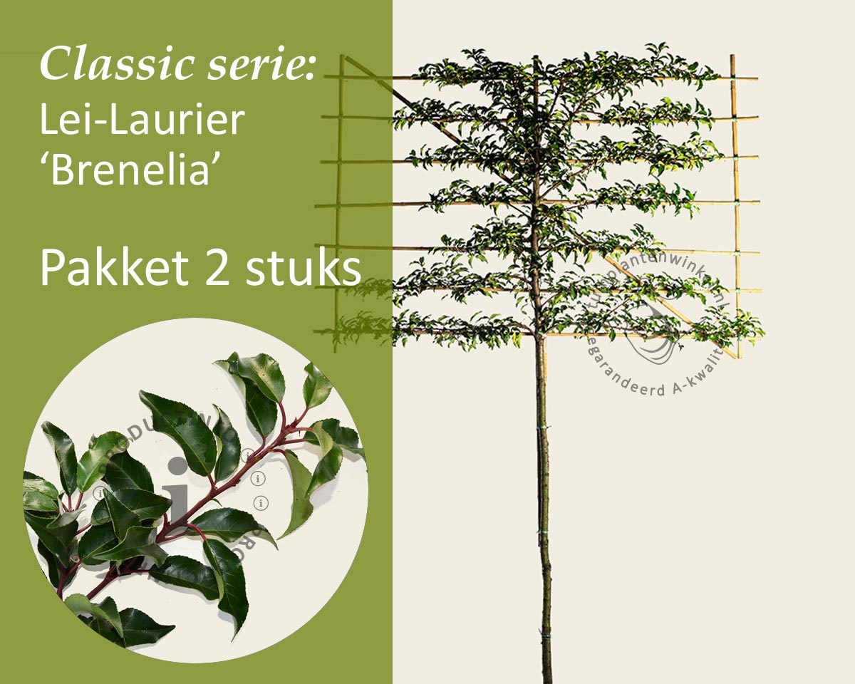 Deze Portugese laurier als leiboom is een groenblijvende leiboom. De bladeren van deze laurierboom zijn wat kleiner dan bij de 'Novita' en 'Caucasica'. De variëteit Brenelia heeft ten opzichte van de 'Angustifolia' een meer gegolfde bladrand. Bovendien hebben de bladstelen vooral in de wintermaanden een rodere kleur. Het blad is donkergroen van kleur en glanst aan de bovenzijde. Deze boom is goed te snoeien en daardoor goed geschikt als leiboom.